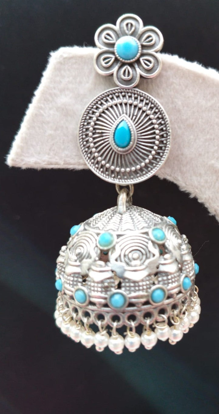 An exquisite silver-lookalike jhumka inspired by traditional Rajasthani artistry. The stud features a striking kamal chakra (lotus wheel) motif — intricately carved petals forming a perfect radial balance, symbolizing grace and purity. The dangler below is dome-shaped, adorned with detailed etchings reminiscent of royal palaces and heritage craftsmanship. Tiny ghungroos or pearl droplets gently sway at the base, adding a soft rhythmic charm. This jhumka is a statement piece that blends cultural depth with timeless elegance.