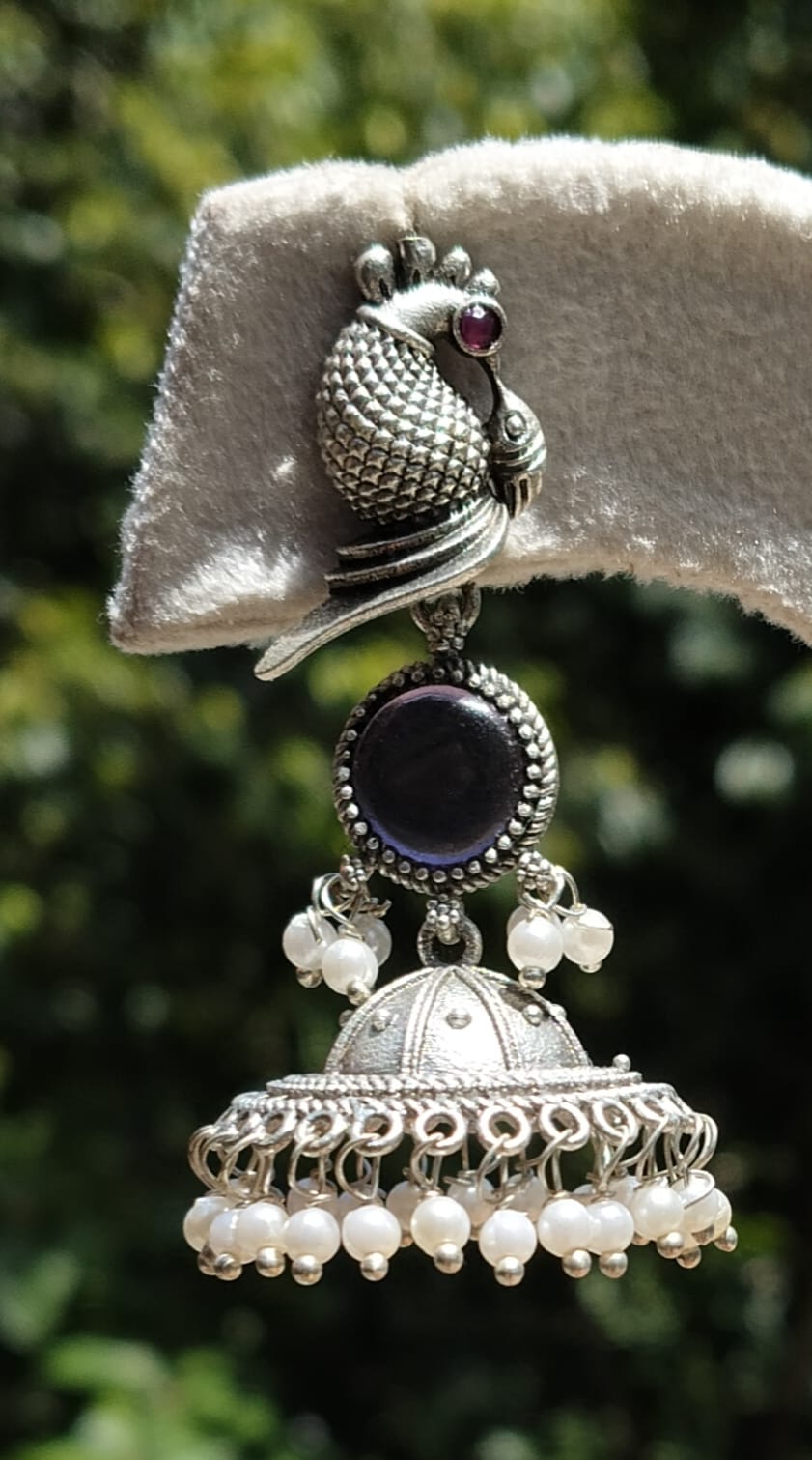 A graceful blend of heritage and artistry, this oxidized jhumka showcases a beautifully detailed mayura (peacock) stud—an emblem of grace and tradition. Suspended below is a semi-domed dangler, crafted with finesse to add a touch of understated drama. An ideal pick for those who admire timeless ethnic elegance with handcrafted charm.