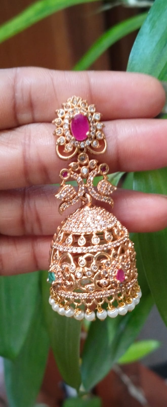 Noorika is a regal ethnic jhumka crafted for the spotlight. Both the stud and the dangler shimmer with a full setting of brilliant AD stones, catching the light from every angle. The dangler is finished with a delicate row of pearl hangings, lending movement and grace with each step. Set in an antique gold frame, this piece blends royal opulence with festive charm — ideal for weddings, temple events, or any occasion that calls for timeless dazzle.
