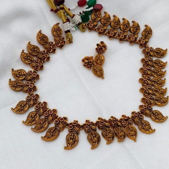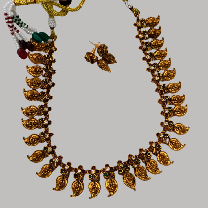 Each manga-shaped element is crafted in an antique gold finish and intricately studded with high-quality ruby-red Kemp stones, reflecting the richness of South Indian temple heritage. The classic curvature of the mango motif engraved with lakshmi, symbolizing fertility and prosperity, makes this piece a cultural statement.