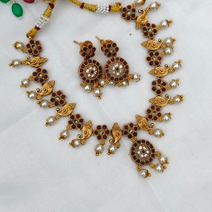 Adorn yourself with timeless elegance—this exquisite neckpiece features a delicate chain adorned with intermittent conch motifs and intricately crafted floral elements. Each flower is embellished with vibrant ruby kemp stones and a sparkling AD stone at its center, creating a radiant contrast. The centerpiece boasts a round pendant encrusted with shimmering AD and kemp stones, finished with graceful pearl hangings that enhance its regal charm. Perfect for weddings and festive occasions, this premium design embodies traditional artistry with a luxurious finish.