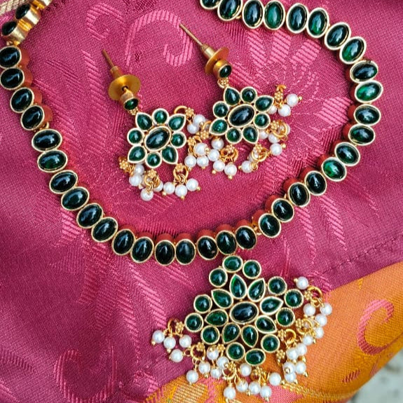 Embodying the elegance of a bygone era, Rajkumari features a golden-toned neck chain studded with a continuous array of lustrous kemp stones. At its heart rests a regal circular locket, richly encrusted with kemp stones and exuding timeless charm. From the locket, delicate pearls sway gracefully, adding a touch of royal allure to this heritage-inspired masterpiece.