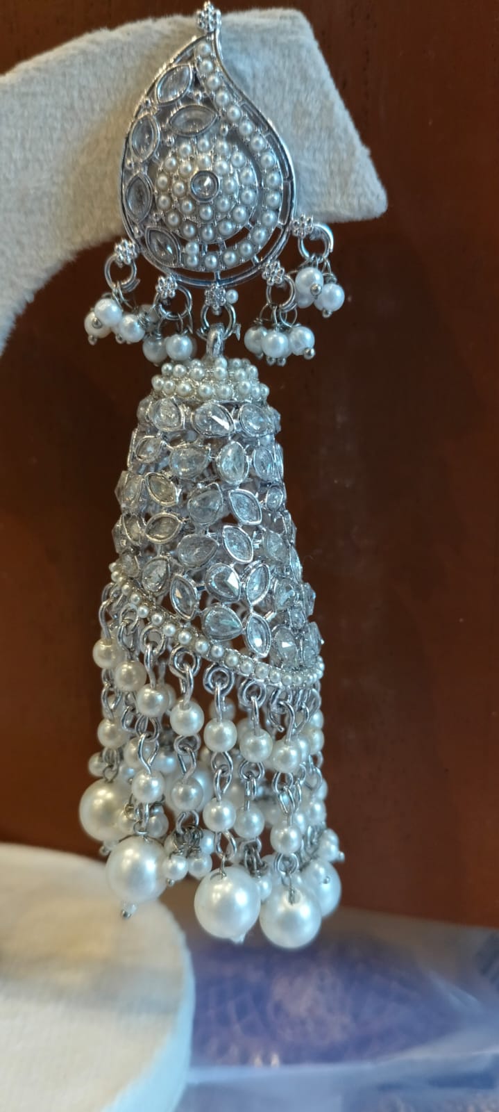 Designed for moments that deserve to shine, the Noor Jhumka is an exquisite statement piece perfect for weddings and grand celebrations. Its elegant cone-shaped dangler features a subtle slanting design, richly adorned with sparkling AD stones and lustrous pearls. The base is finished with graceful pearl hangings that sway with every step, adding a touch of royal charm. True to its name, Noor brings radiant beauty and timeless elegance to your most special occasions.