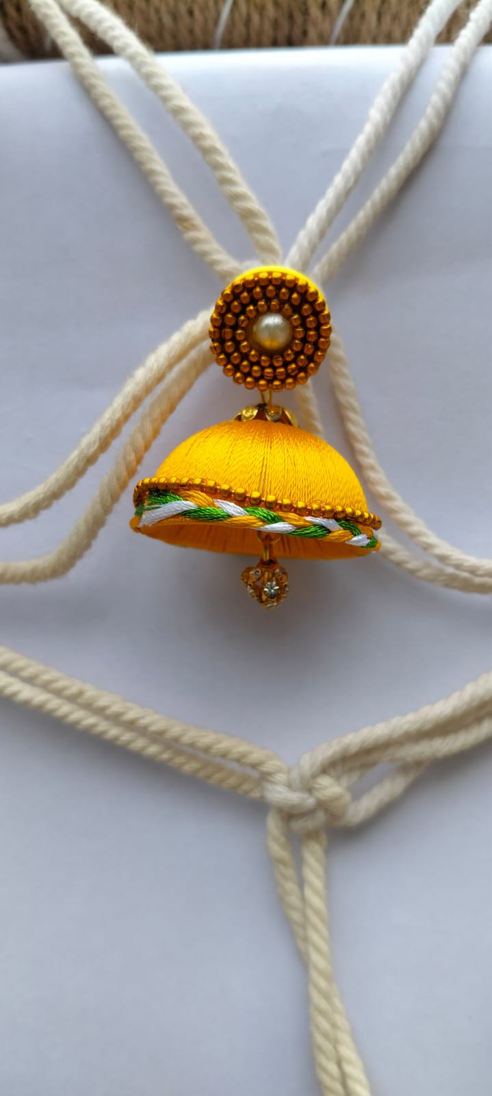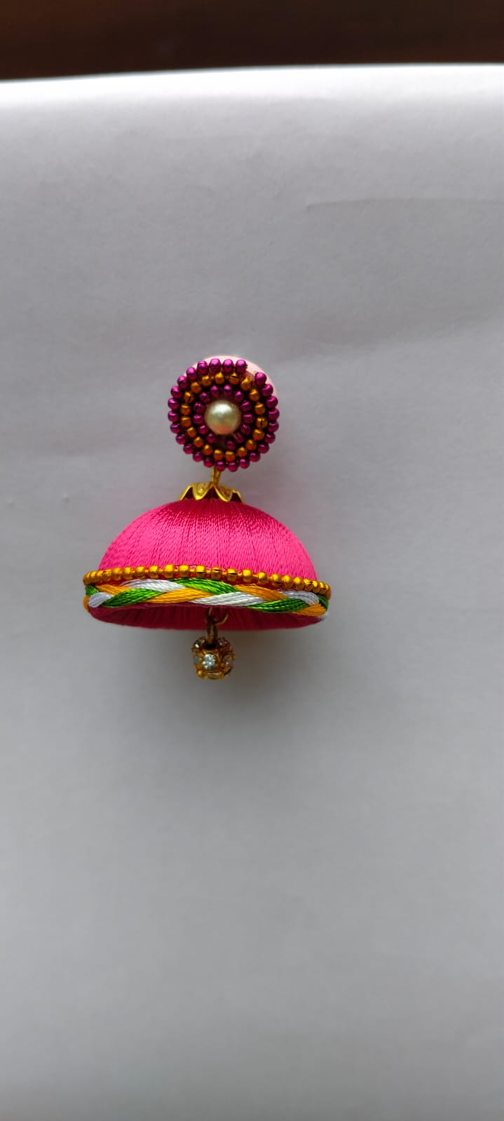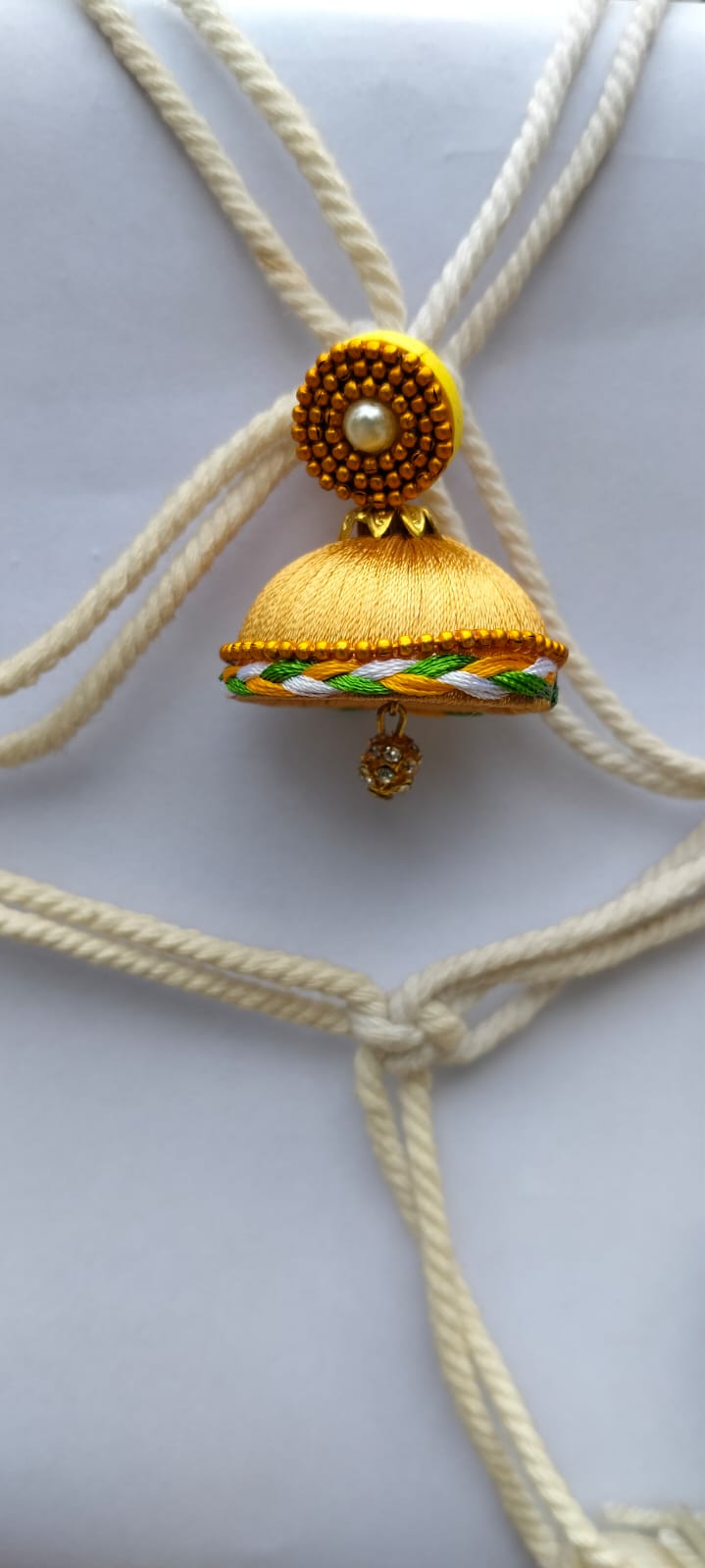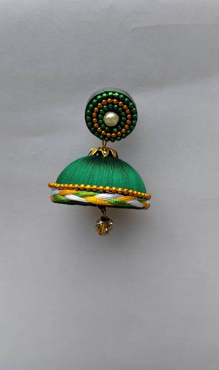 A perfect fusion of handcrafted elegance and subtle sparkle — Kanira Jhumka features vibrant silk thread wrapping and a center-hanging drop of a golden bead crowned with a shimmering AD stone. This graceful accent adds movement and a touch of royalty to every turn, while slight handmade variations make each pair one-of-a-kind.