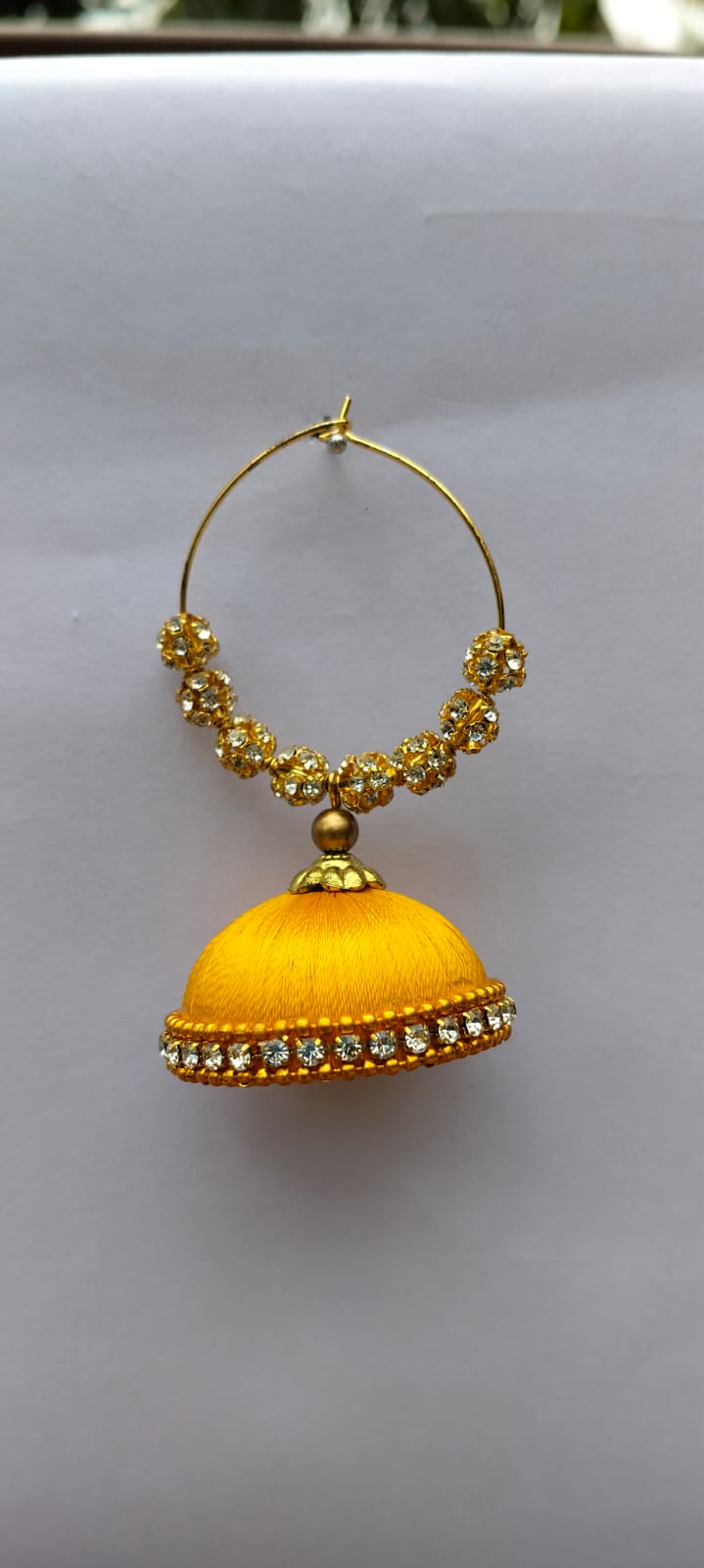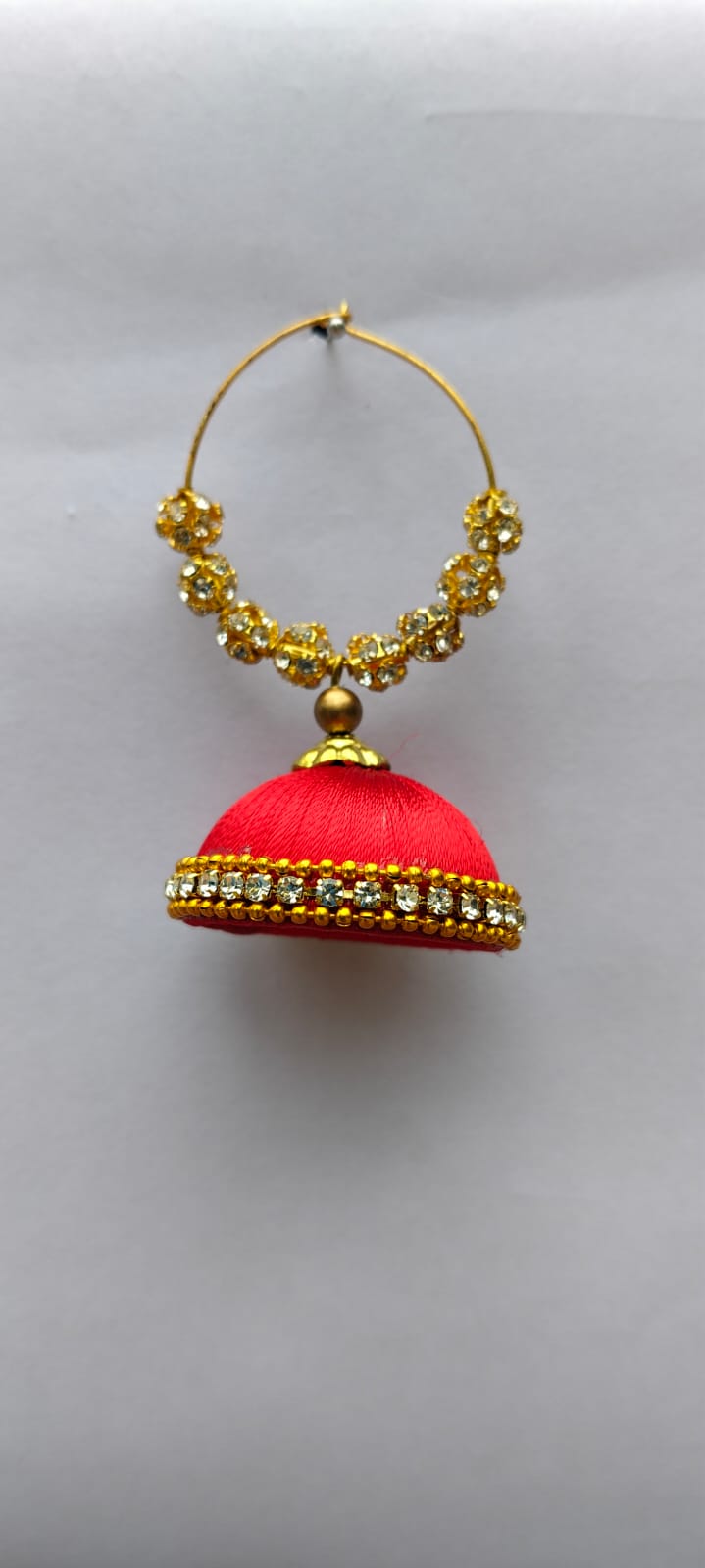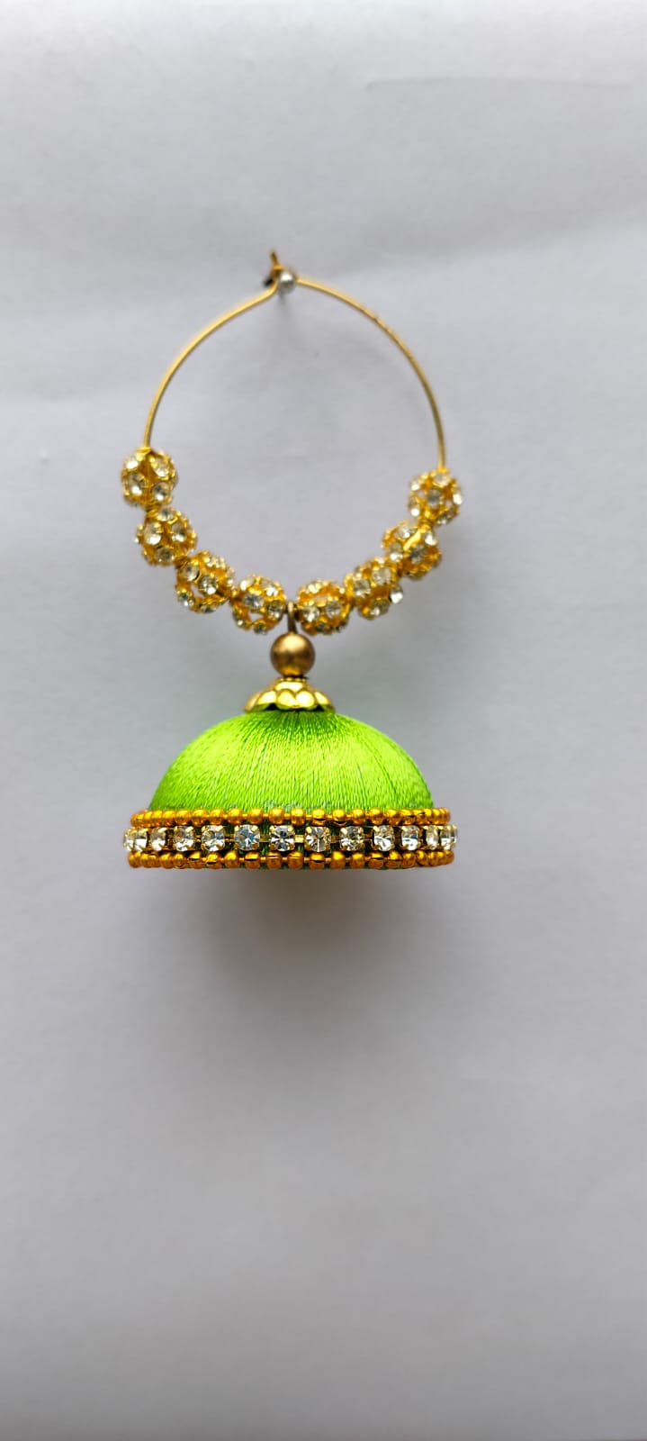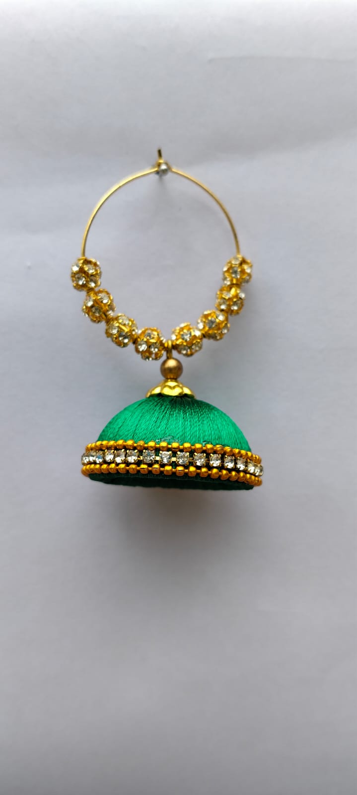 Delicate silk thread wraps meet a golden hoop adorned with soft gold beads and shimmering AD stones – Saanjh Jhumka captures the quiet glamour of twilight. Handcrafted with vibrant threads and a touch of sparkle, these earrings blend traditional artistry with festive elegance. Minor handmade variations only enhance their charm.