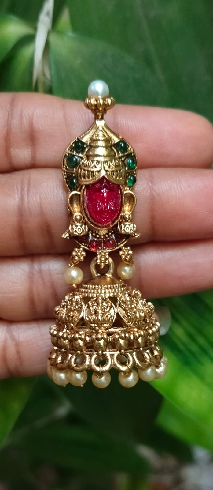 The Perumal Jhumka blends the richness of traditional sculpture with refined ethnic charm. The stud features a striking face design, finely detailed in deep red tones, inspired by classical South Indian artistry. Below, the dangler showcases an elegant motif, capturing the balance of strength and grace. With its antique gold finish and hand-carved detailing, this jhumka is a tribute to heritage craftsmanship — perfect for those who appreciate timeless design with cultural depth.
