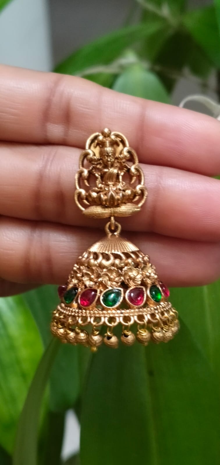Embody brilliance and divinity with the Taruvi Kemp Jhumka—a radiant celebration of heritage and craftsmanship. The ornate stud features good-quality Kemp stones in traditional ruby and emerald tones, intricately framing a beautifully carved goddess motif that adds spiritual depth and festive allure.