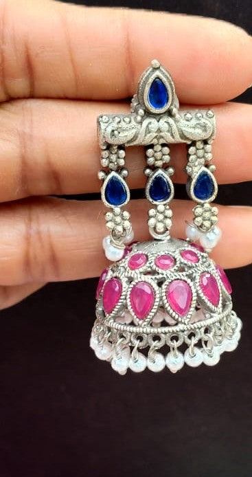 The Jhum Tarang Jhumka is a rhythmic blend of structure and sparkle. The stud features three elegant, parallel lines embedded with vibrant colored stones, creating a wave-like visual that catches the light with every movement—echoing the name Tarang (meaning ripple or wave). From this modern linear design gracefully descends a traditional dome-shaped dangler, delicately crafted with ornamental detailing. At its base, lustrous pearls dangle softly, adding movement and classic charm. A perfect fusion of contemporary design and timeless tradition, ideal for festive and semi-formal occasions.