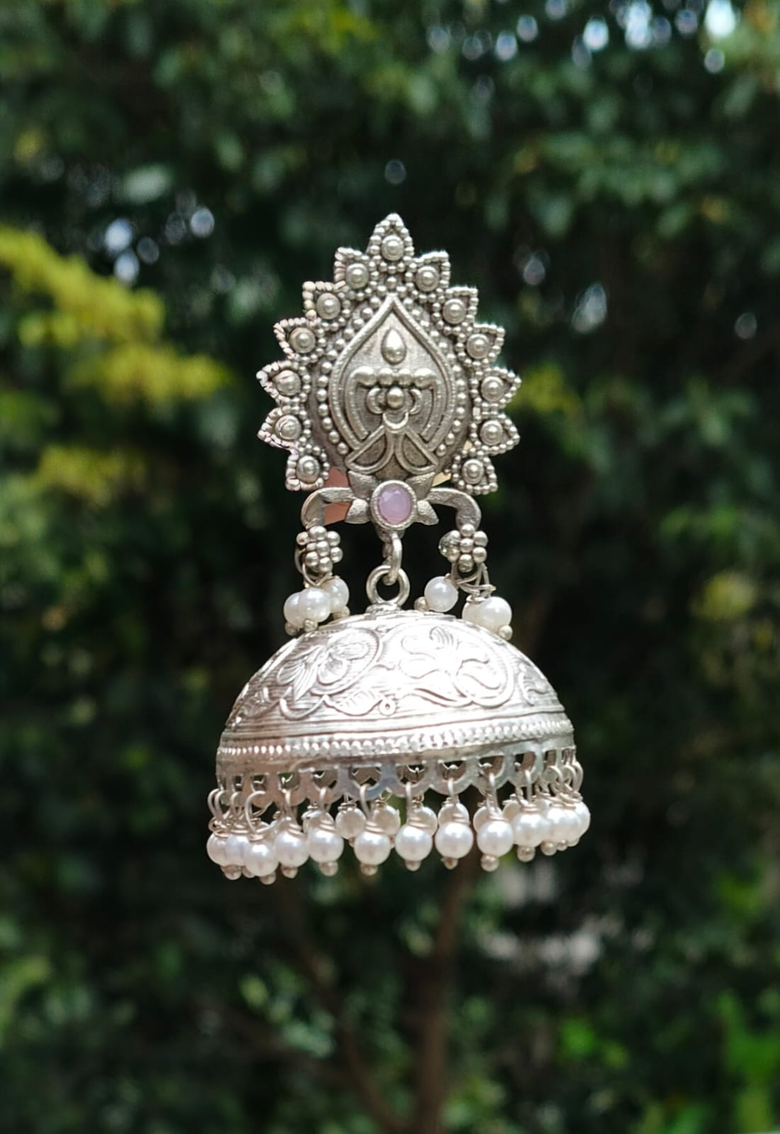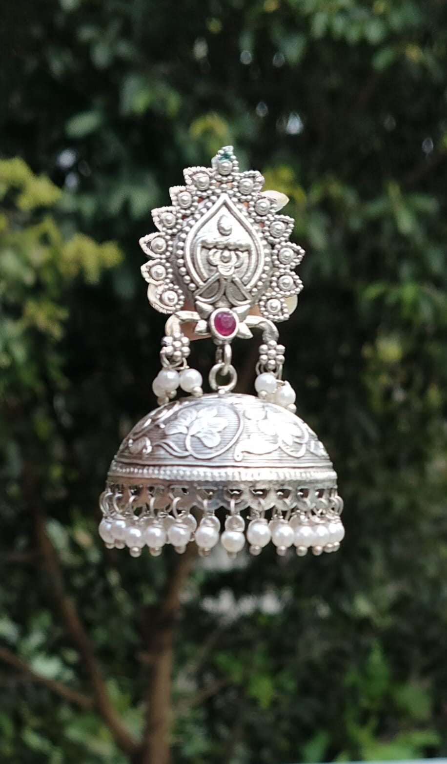 A timeless tribute to regal artistry, the Madhuri Jhumka features Rajasthani royal engravings intricately etched into both the stud and the dangler. The ornate design reflects the grandeur of palace heritage and handcrafted brilliance. With its antique silver finish and exquisite detailing, this jhumka is perfect for those who admire cultural elegance and vintage charm.
